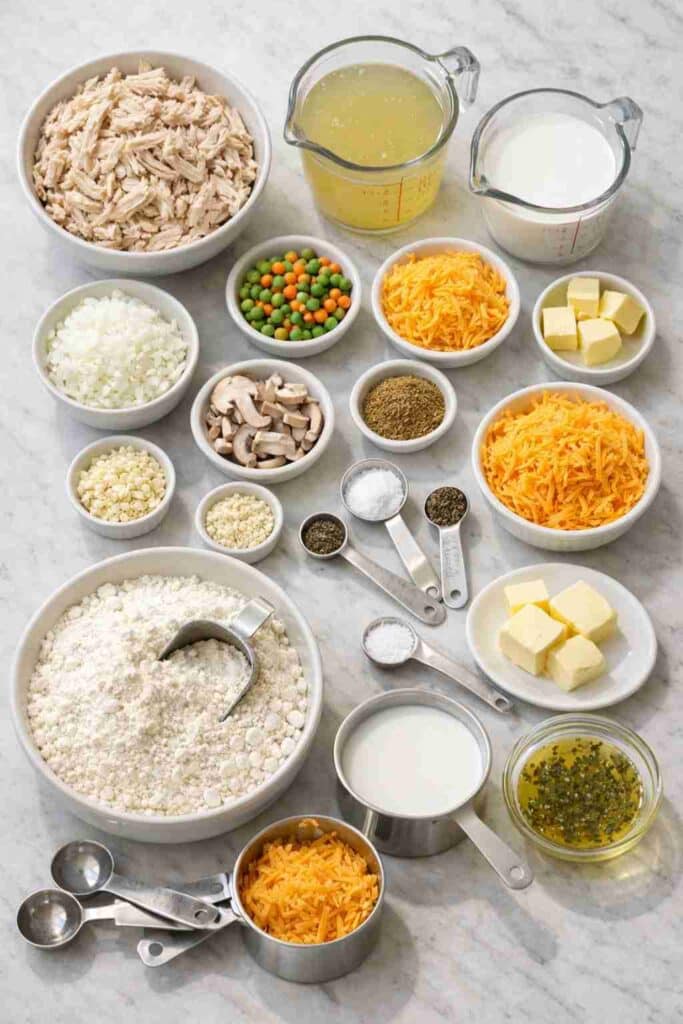 Frozen Peas and Carrots (1 cup, optional): Bring color, nutrients, and a classic chicken pot pie feel to the dish.