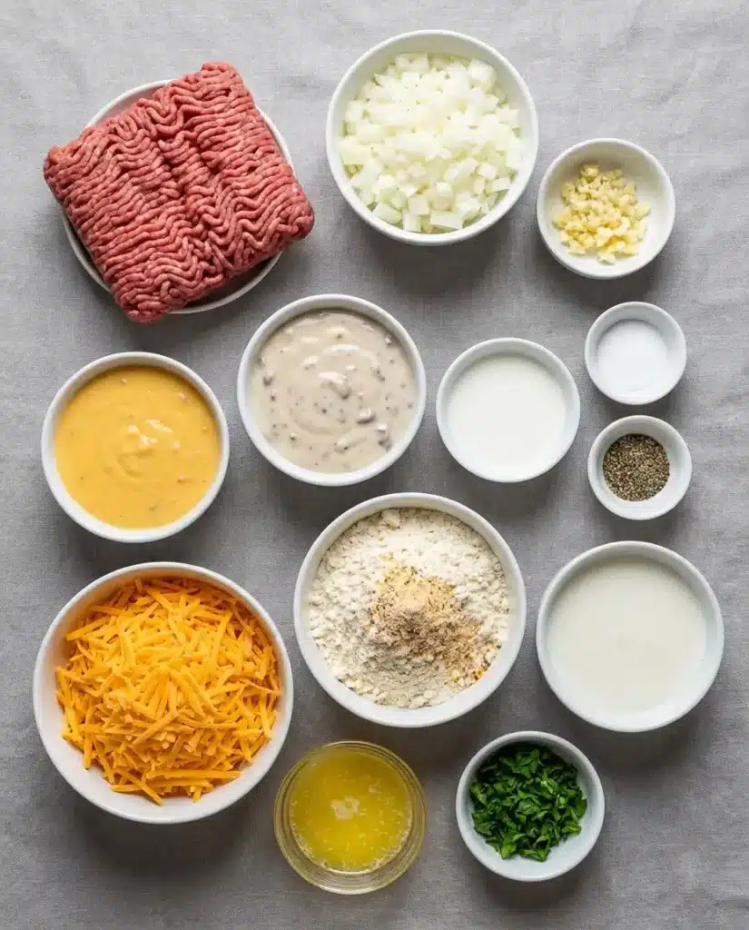 Condensed Cheddar Soup (10.5 oz): Adds creaminess and cheesy richness to the beef base. It’s what gives this cobbler that smooth, velvety texture every bite needs.