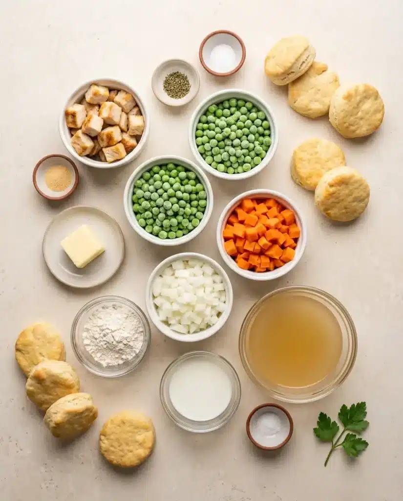 Refrigerated Biscuit Dough – The easiest topping for a modern pot pie casserole. The biscuits bake into fluffy, golden pillows that absorb just enough gravy for perfection.