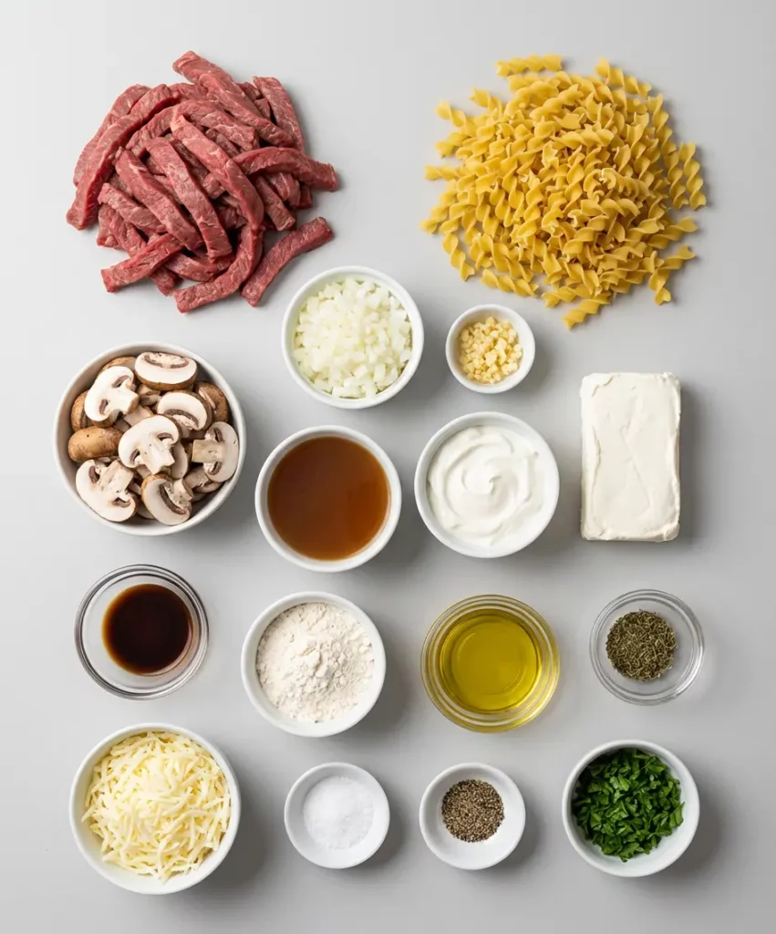 Let’s take a closer look at the key ingredients that make this Creamy Beef Stroganoff Casserole irresistibly rich and flavorful.