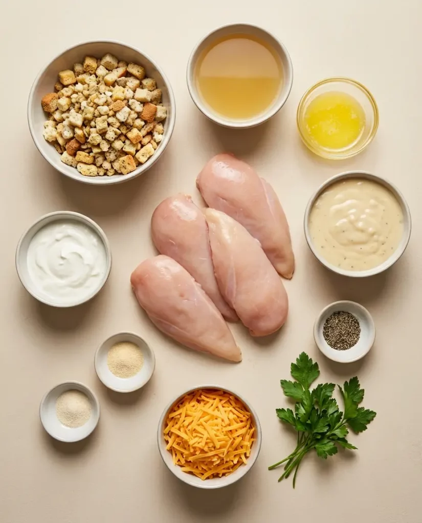 - Sour Cream (½ cup): Adds tang and creaminess, balancing the savory stuffing and tender chicken.