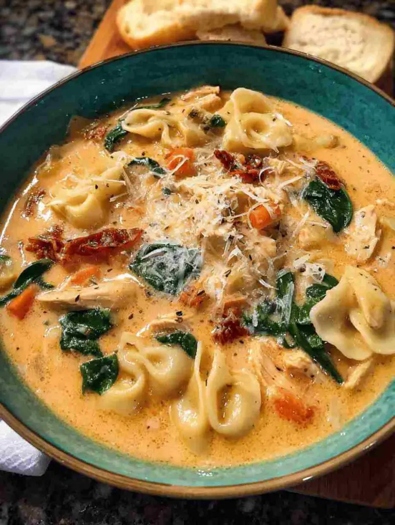 Every spoonful is packed with tender chunks of chicken, sweet carrots, savory sun-dried tomatoes, and fresh spinach—all swimming in a velvety Parmesan cream broth. It’s the kind of meal that feels indulgent but is surprisingly easy to make, perfect for busy weeknights or special occasions. The aroma alone—garlic, Italian herbs, and rich cheese melting into warm cream—will make your kitchen smell heavenly.