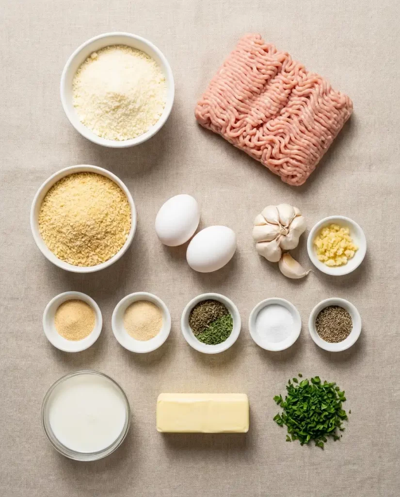 - In a large bowl, mix ground chicken, Parmesan, panko, eggs, minced garlic, garlic powder, onion powder, basil, parsley, salt, pepper, and milk until evenly combined but not overmixed.