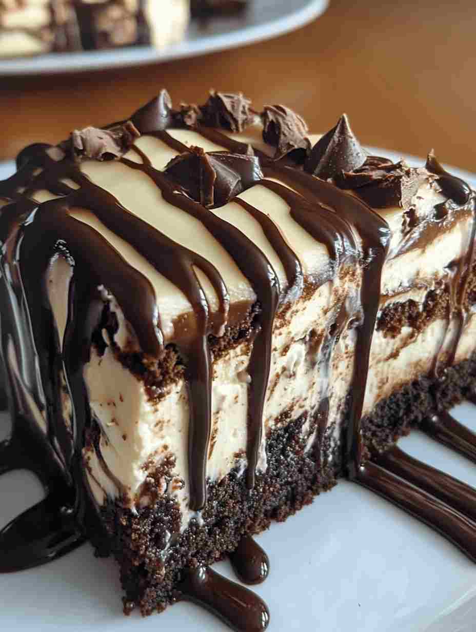 Serve each slice chilled with a dollop of fresh whipped cream and an extra drizzle of hot fudge. For a full sundae experience, add a scoop of vanilla ice cream on the side. Pair it with coffee or espresso to balance the richness, or serve alongside a fresh fruit salad to lighten the plate.