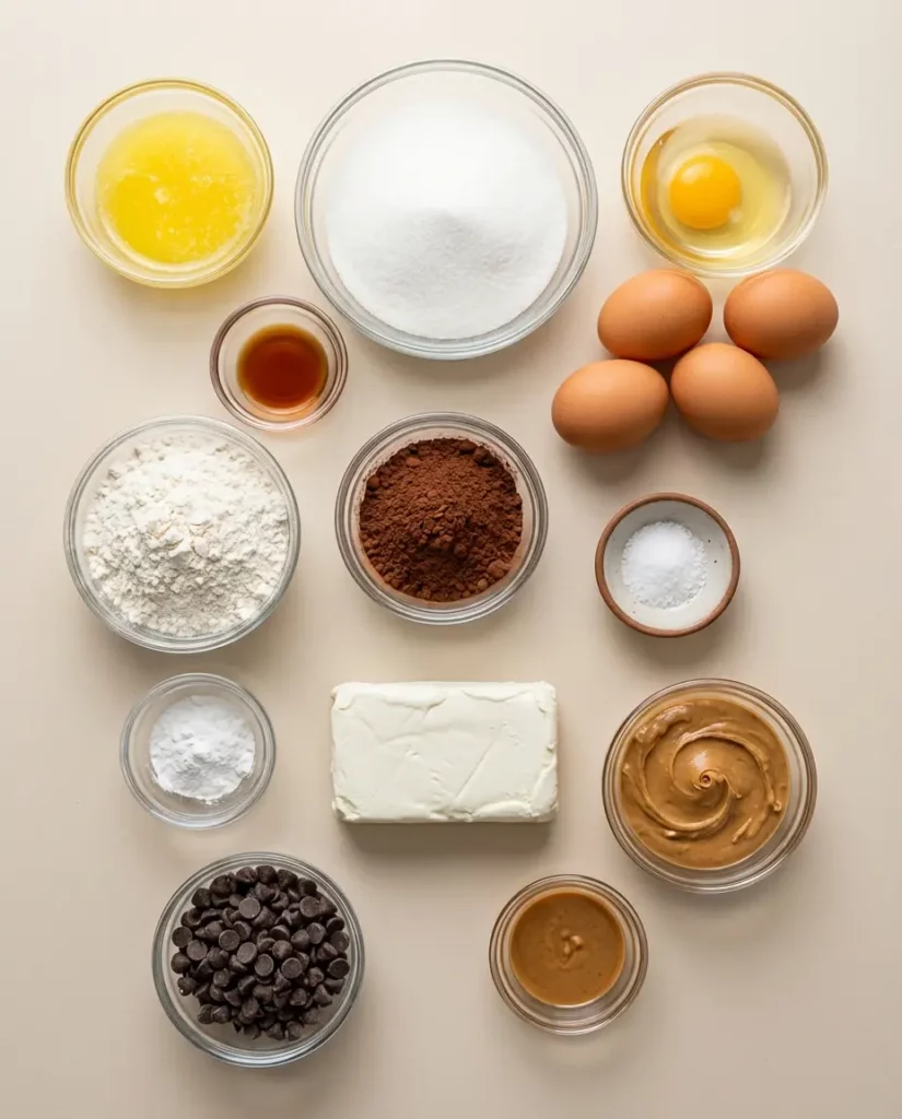 - Cream Cheese (8 oz): Smooth, tangy, and creamy—creates the cheesecake texture that complements the rich brownie.
