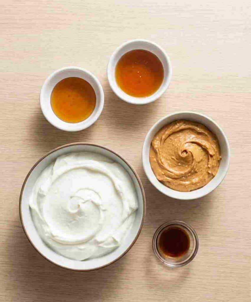 - In a mixing bowl, combine Greek yogurt, peanut butter, vanilla extract, and honey or maple syrup if using.