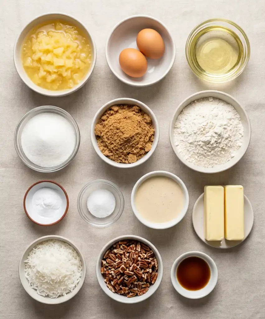 Crushed Pineapple with Juice – Adds natural sweetness, moisture, and bright tropical flavor, making this cake incredibly soft without extra liquid.