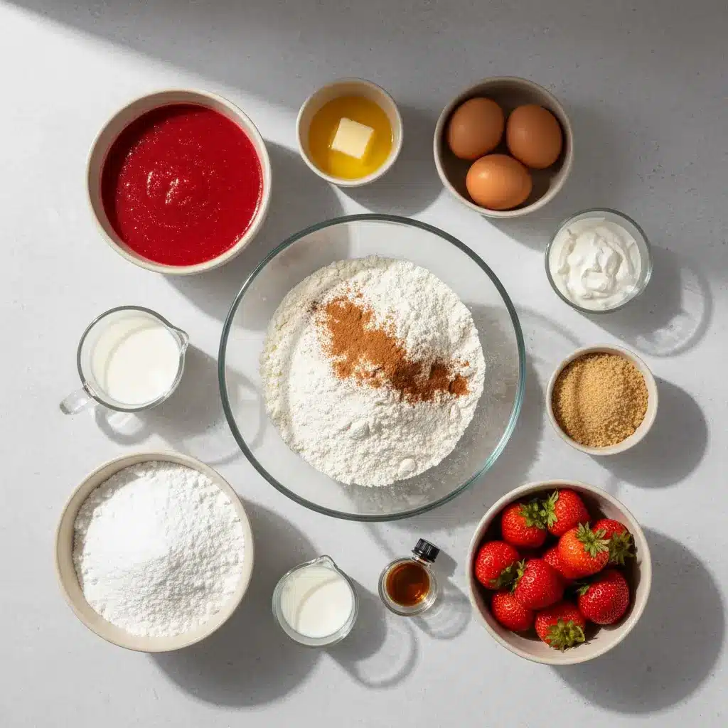 Powdered sugar forms the smooth base of the strawberry cream icing, giving it that classic drizzle consistency.
