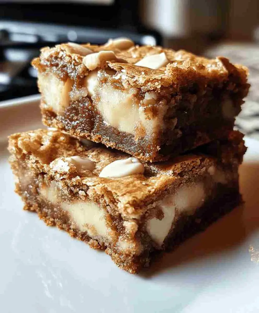 Blondies, sometimes called “blonde brownies,” originated in American baking as a variation that swaps chocolate for butterscotch or vanilla flavors. While classic brownies center on cocoa, blondies highlight buttery richness and often include mix-ins like nuts or chocolate chips. Adding white chocolate chips merges two dessert traditions — blondie and chocolate chip cookie — resulting in a hybrid treat beloved in modern American home baking. This recipe brings that hybrid into the spotlight as a modern comfort food dessert that fits holiday tables or everyday indulgence.
